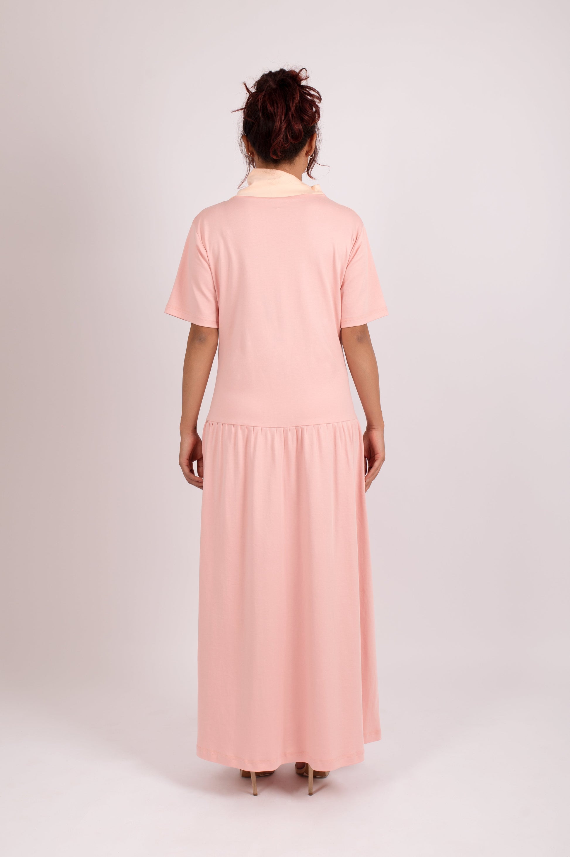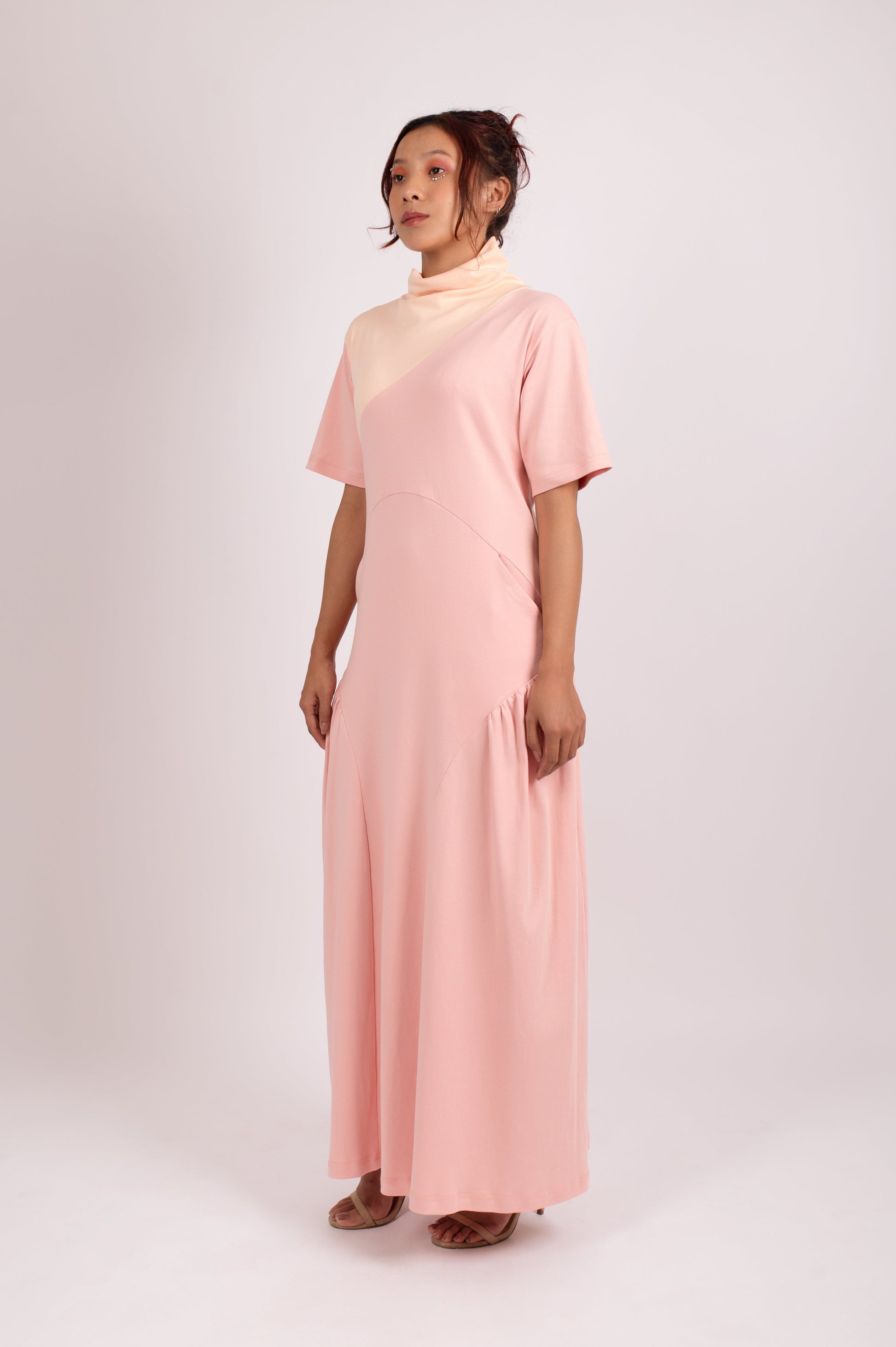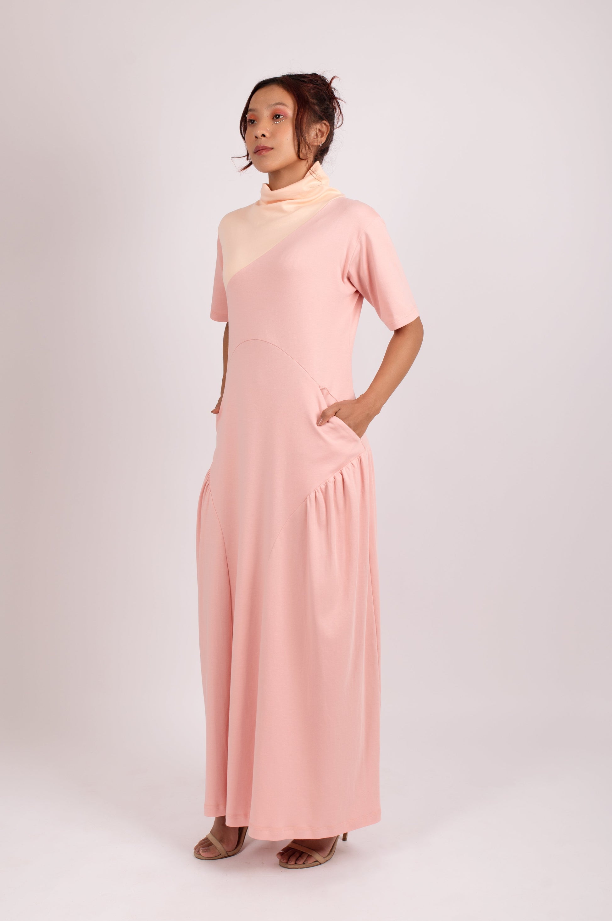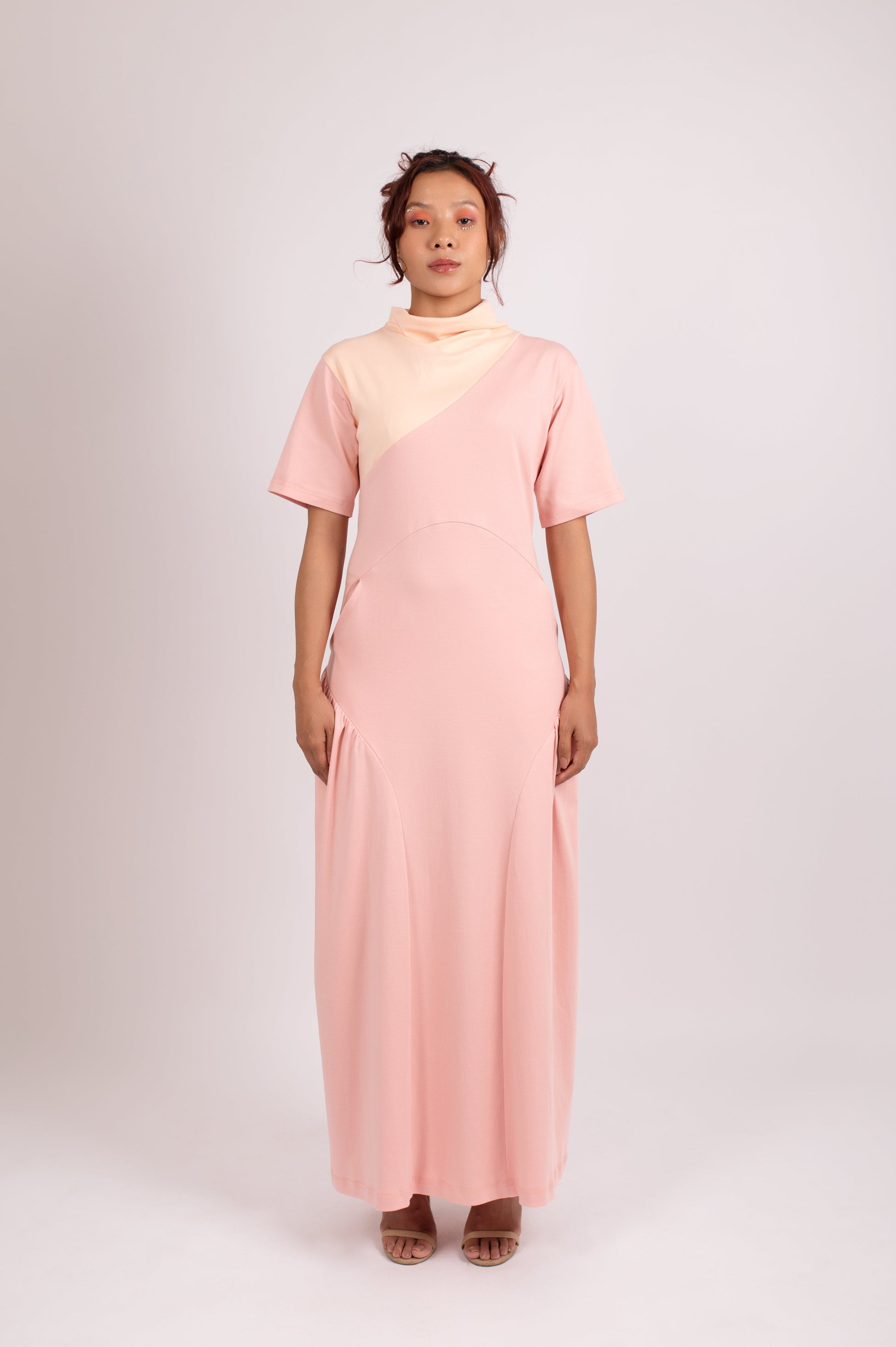 An abstract coul neck pleated long dress with half sleeves and light panel pleates at the sides.