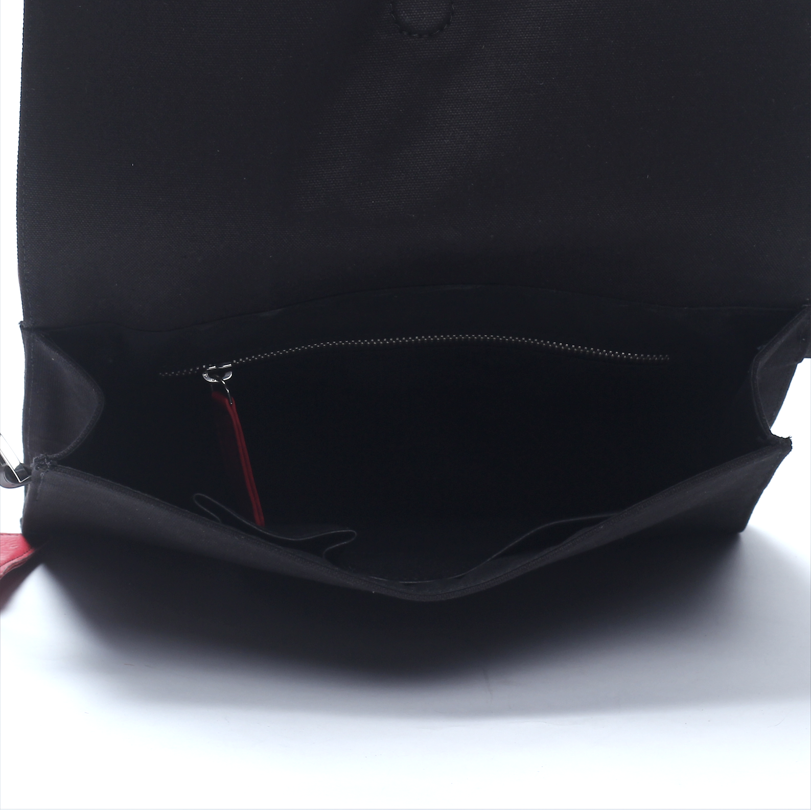 Anoir cross body clutch bag with zipper closure and corner cuts. Red version is made out of black canvas and red cow leather with silk screen printing. Black and grey version is made of black canvas and cow leather.