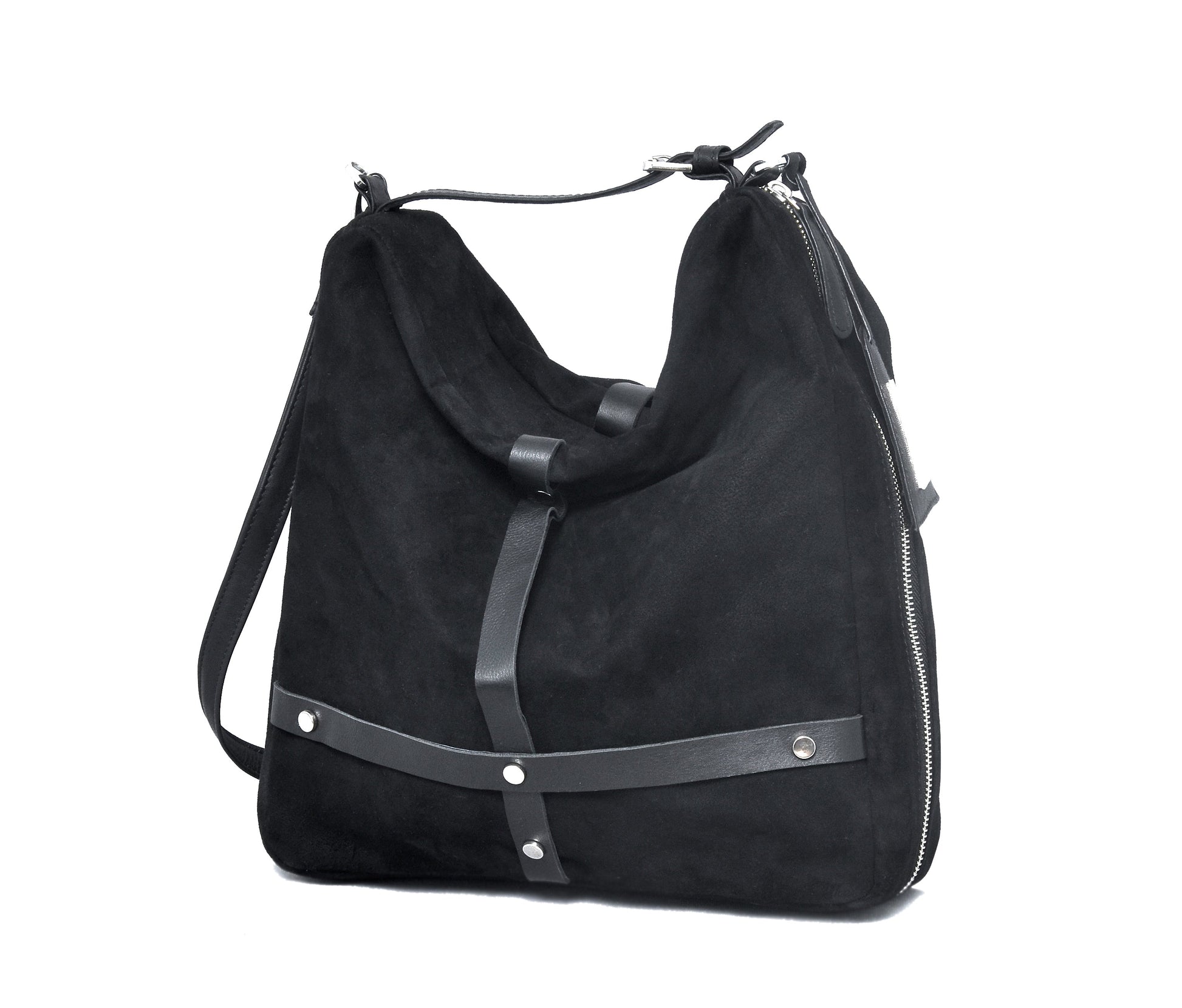 Anoir black transformable shoulder bag with a side zipper closure and soft corners is made out of suede leather. The top can be transformed with a detachable buckle for various shapes. The design of the bag is inspired from the dogma of belief in Earth's orbital movement and human's religious practices. It is a unisex bag and made from industry surplus leather and natural cotton canvas, thus supporting re-use, sustainability, slow fashion and anti-mass production, overconsumption.