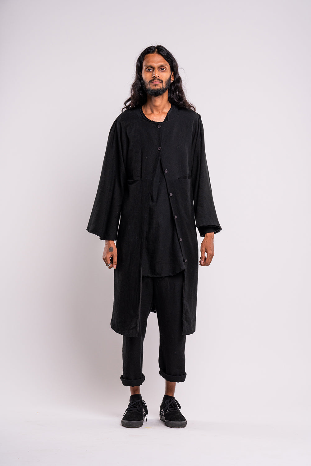 The Jacket Dress from Anoir by Amal Kiran Jana is made from a black hand woven natural cotton with a hexagonal neckline. This jacket features long wide sleeves, raw edges, a button front and two large slouch chest pockets.